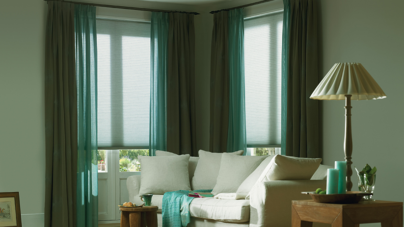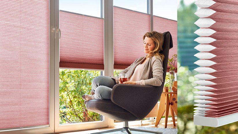 Die Wabenstruktur der DUETTE® Faltstores bildet am Fenster ein elegantes, gleichmäßiges Bild. Weil Zugschnüre und Spanndrähte verdeckt innerhalb der Waben laufen, werden die unerwünschten Lichtschlitze vermieden. Die Luftpolster innerhalb des Plissees sorgen für einen wohltuenden Temperaturausgleich. DUETTE® ist geeignet für alle Fensterformen und für viele Dachfenster, unter anderem für alle Veluxtypen.